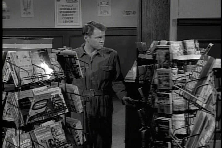 In the very first episode of The Twilight, titled Where is Everybody? - October 2, 1959, there is a PJF sighting. The main character finds himself walking down a road towards a completely empty town. He goes in all of the businesses looking for people but he cannot find anyone. He does find things like half eaten plates of food and still smoking cigars, so it seems like everyone has just vanished. At one point he goes into a drug store/soda fountain and walks over to the book racks. There we see several copies of the first paperback edition of THE GREEN ODYSSEY.
